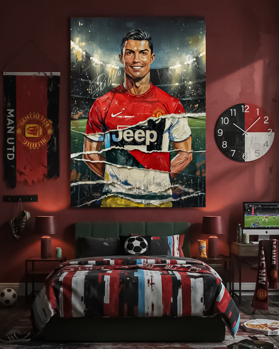 Arreda i tuo spazi con l’essenza di un campione assoluto con CR7 CLUBS. Questo ritratto a tecnica olio di Cristiano Ronaldo celebra la carriera del GOAT attraverso un design curato in ogni dettaglio: la sua firma iconica, lo sguardo determinato e una maglia unica, costruita da un collage delle texture e dei particolari di tutte le maglie  delle squadre in cui ha giocato. Un omaggio visivo alla mentalità del numero 7 più famoso al mondo, tra record, trofei e momenti leggendari.