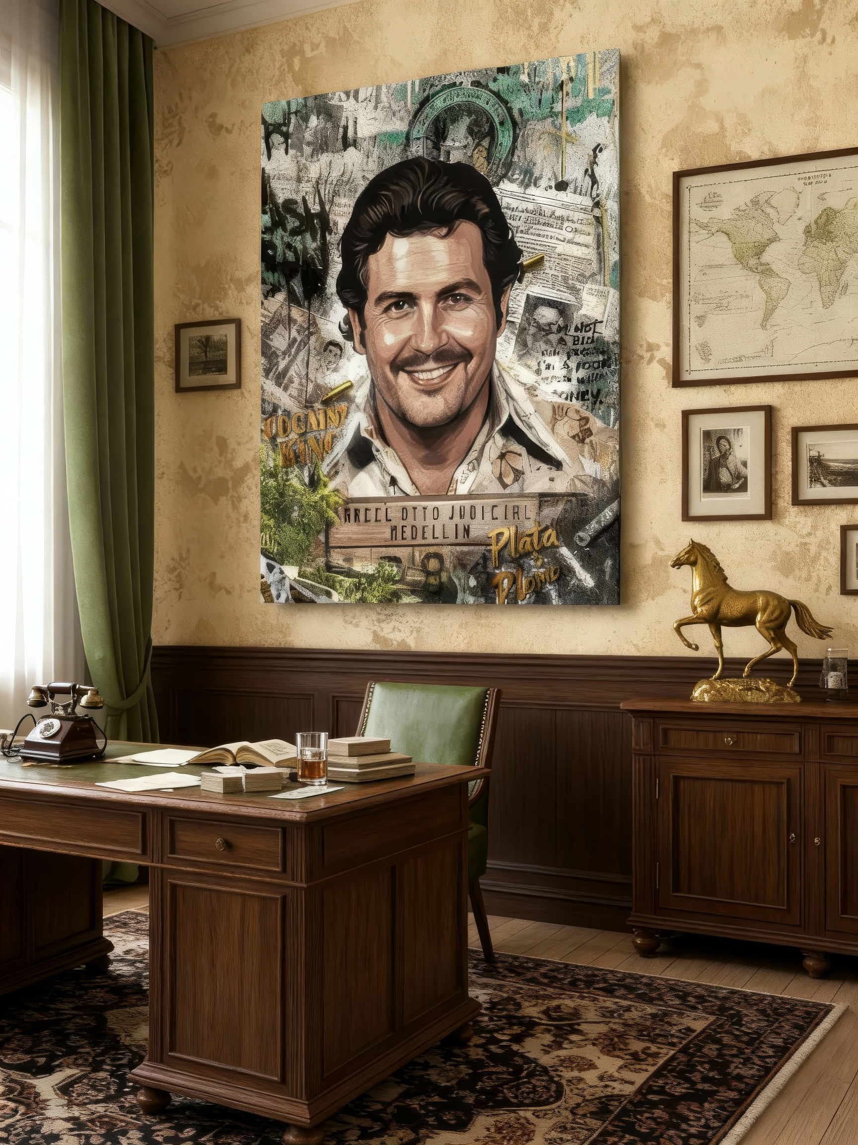 Porta un pezzo di storia e di design autentico nella tua casa con PABLO’S LIFE. Ogni dettaglio di questo design è disegnato a mano, rendendo ogni stampa davvero unica: frasi celebri di Pablo Escobar, collage del suo passaporto originale e articoli di giornale reali, tutto reinterpretato con creatività artigianale.