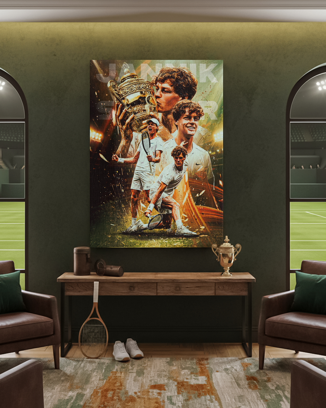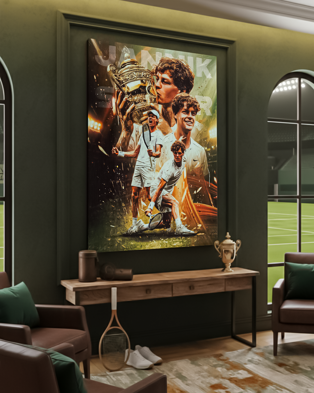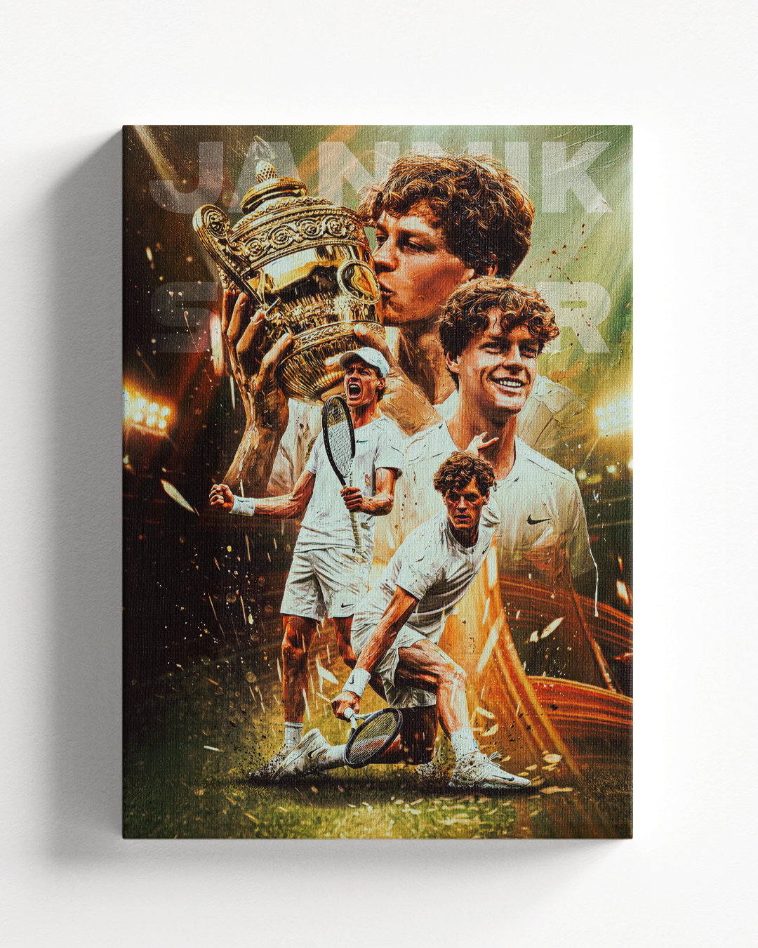 Aggiungi ai tuoi spazi l’energia vincente e determinata di Jannik Sinner con SINNER CHAMP. Il quadro raffigura il campione italiano nel momento simbolo della vittoria a Wimbledon: sguardo concentrato, trofeo in mano e tutta la tensione trasformata in gloria. Una scena che celebra non solo il trionfo sportivo, ma anche il percorso fatto di sacrificio, mentalità e lavoro costante che lo hanno portato in cima.